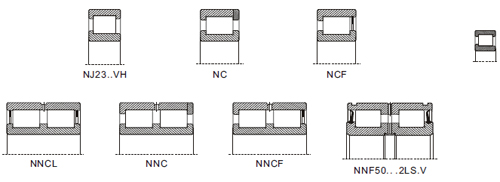Dòng NCF...Các vòng bi này có hai mặt bích tích hợp ở vòng trong và vòng ngoài với một mặt bích tích hợp ở một bên và một vòng giữ nằm trong rãnh chu vi ở phía đối diện. Do đó, các vòng bi này chỉ có thể chịu được lực dọc trục nhỏ theo một hướng.